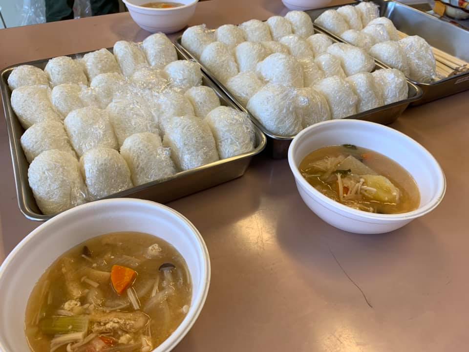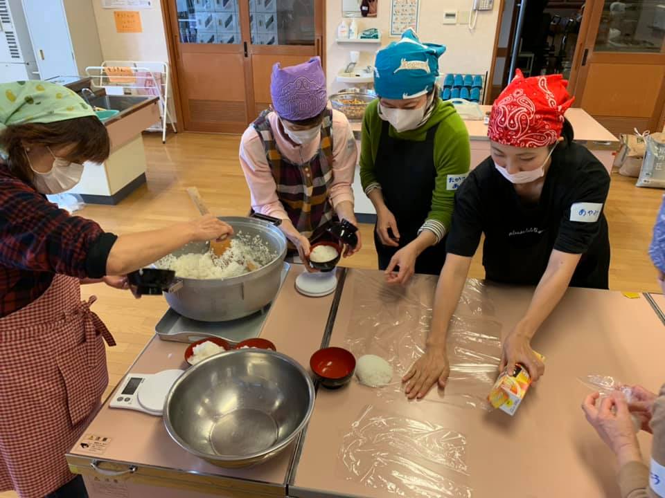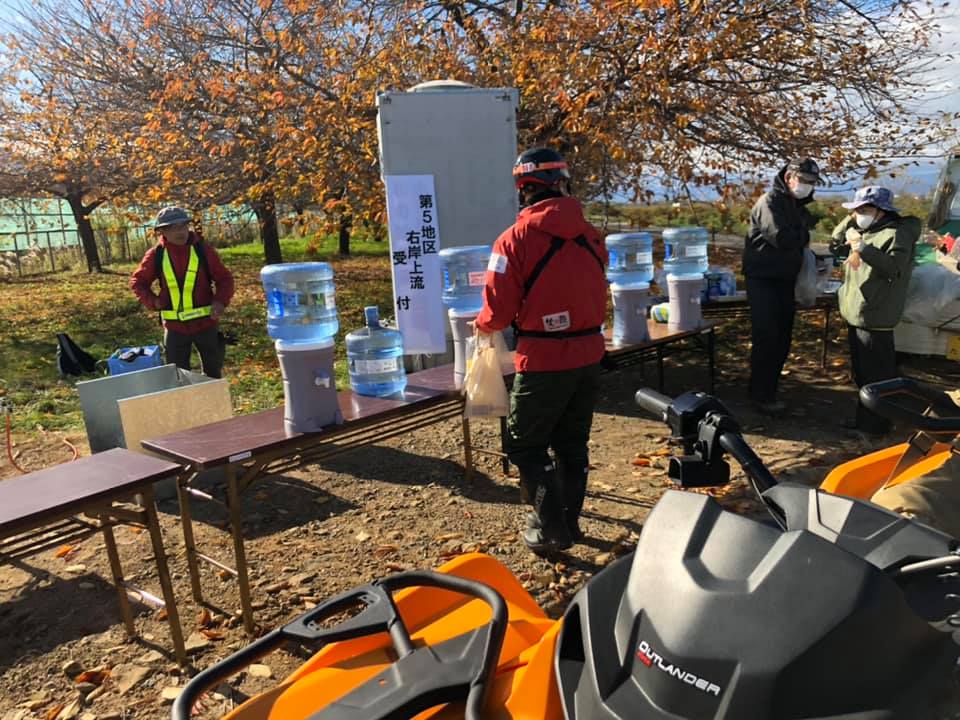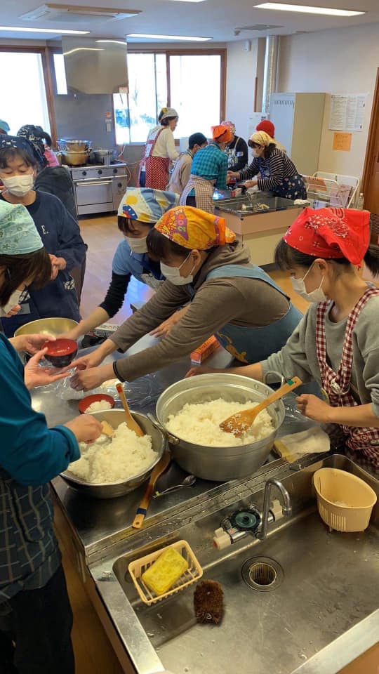 小布施側堤防に3ヶ所、豊野側堤防に2ヶ所、合計5ヶ所で一気に!しっかり戦略を立て、それぞれの堤防に汁本部を設け煮炊きの基本はそこに集中。仕上がった汁を同堤防の炊き出し場所へ運搬。汁物の具材は北斎ホールの調理室で、おにぎりは小布施町社会福祉協議会の調理室でそれぞれの班に分かれて作業を行いました。
