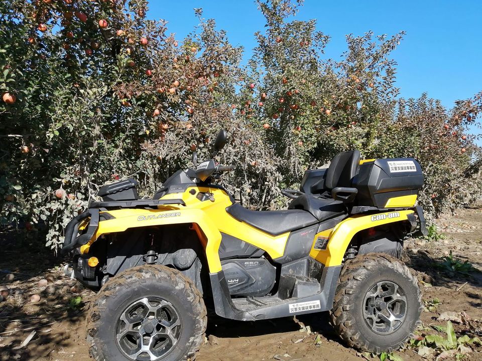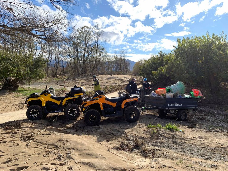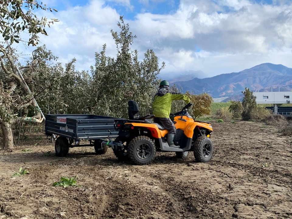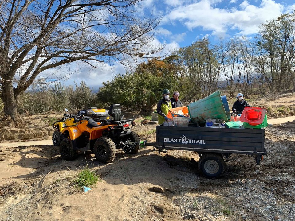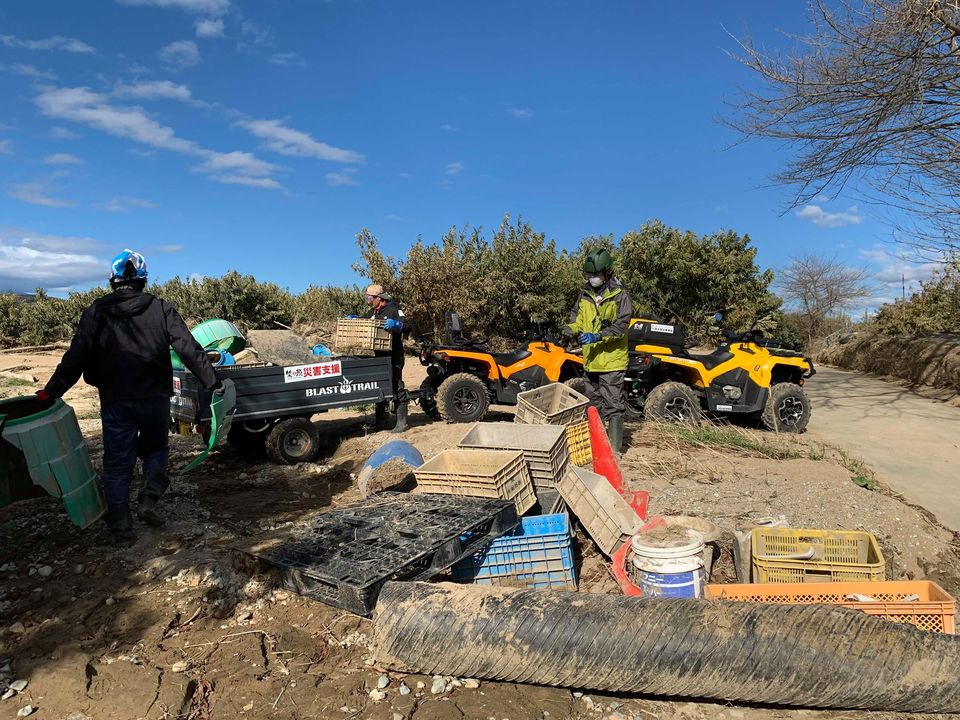 2019 年11 月23 日。台風19号発生から40日余りを経た勤労感謝の日に、千曲川河川敷エリアの果樹畑にて、小布施町主催のご み拾い・リンゴ落としのボランティア活動が行われました。参加者は、最終集計では900人余りに。日本笑顔 プロジェクトでは、この活動に合わせて炊き出しを決行。堤防の片側はボランティアさん用の駐車場となっており、場所によりすれ違いがギリギリだったり、堤防上でUターンの必要があったりと、小回りのきく車両でないと対応できない状況。ここで、全長約1kmの小布施橋を挟んだ5拠点の間をつなぎ、必要物資や塩むすび・つみれ汁の運搬を担ったのが、2台のATVバギー(1台は単体、1台は荷台付きでした)。狭い通路での走行や悪路の走破性に優れ、何よりドアがないため乗り降りが楽。小布施側の畑ではタイヤやコンテナ類の大型のごみも多く、バギー隊は途中からごみの回収もお手伝い。畑にはまだ泥や土が多く、軽トラでは車輪を取られて動けなくなってしまうので、四輪独立サスペンションでパワーのあるバギーが力を発揮しました。