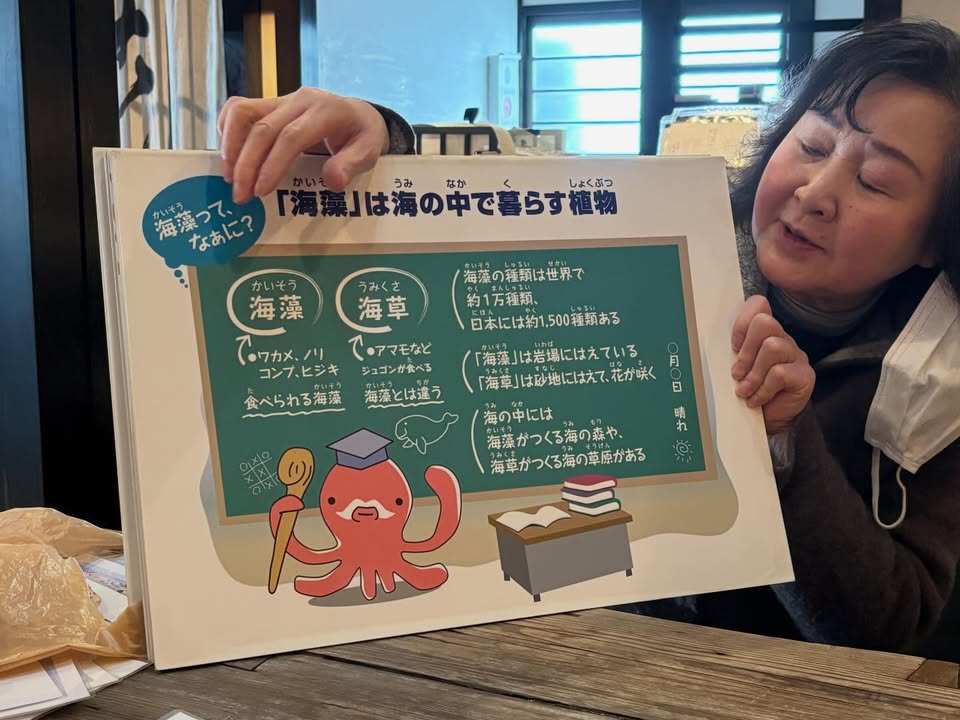 さらに、海藻についての詳しいお話や、なんと紙芝居までご披露いただきました。支援作業に行ったはずが、気づけば私たちが学ばせていただく時間に。作業だけではない、住民の皆さんとの交流こそが、一番の学びだったかもしれません。