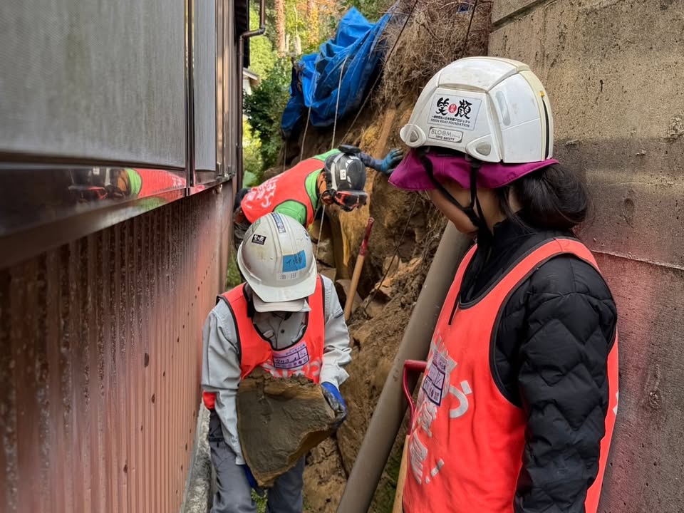 1件目のお宅は石膏ボードの壁材で、壁裏に配線等がありますので、傷つけない様に。更に粉塵が舞う中での活動となりますので、換気をしっかりしつつ、PPEを整えての活動となりました。