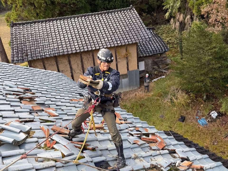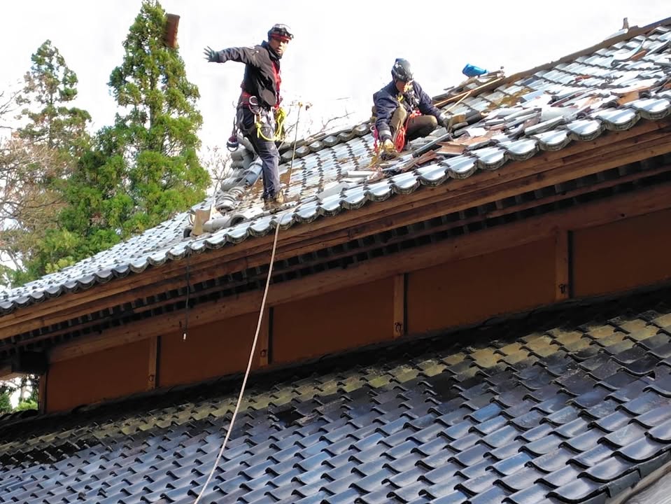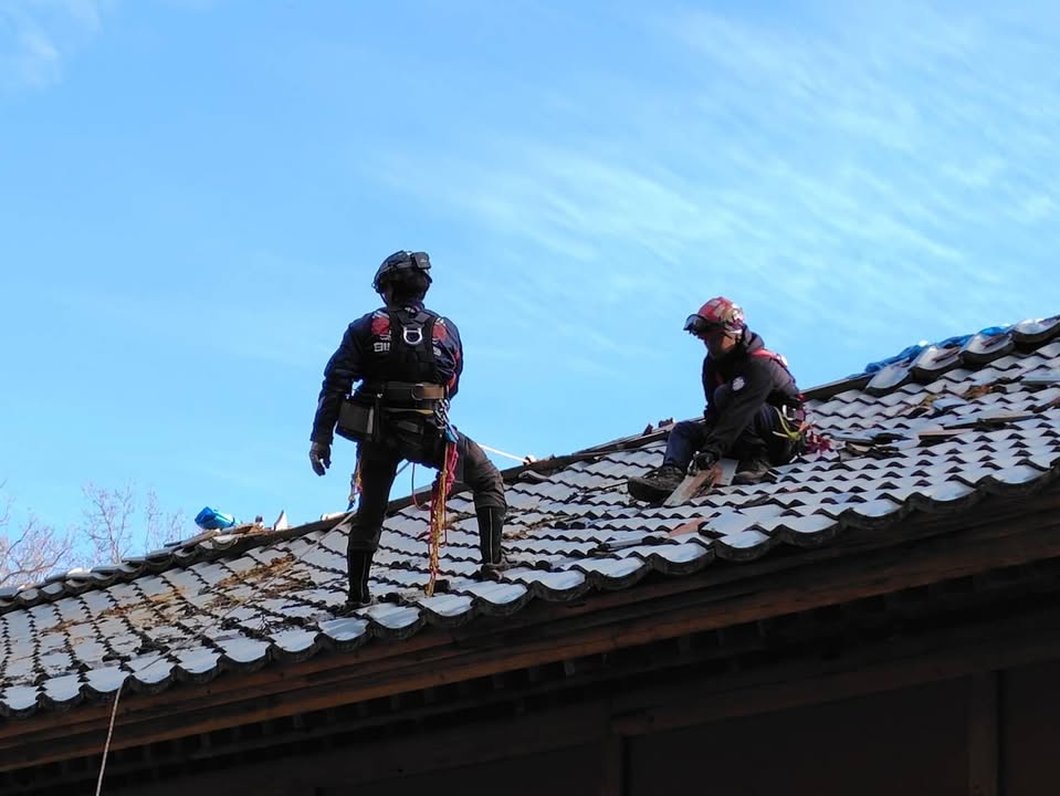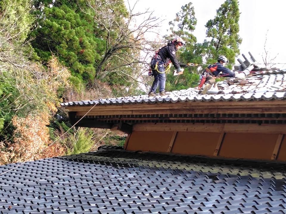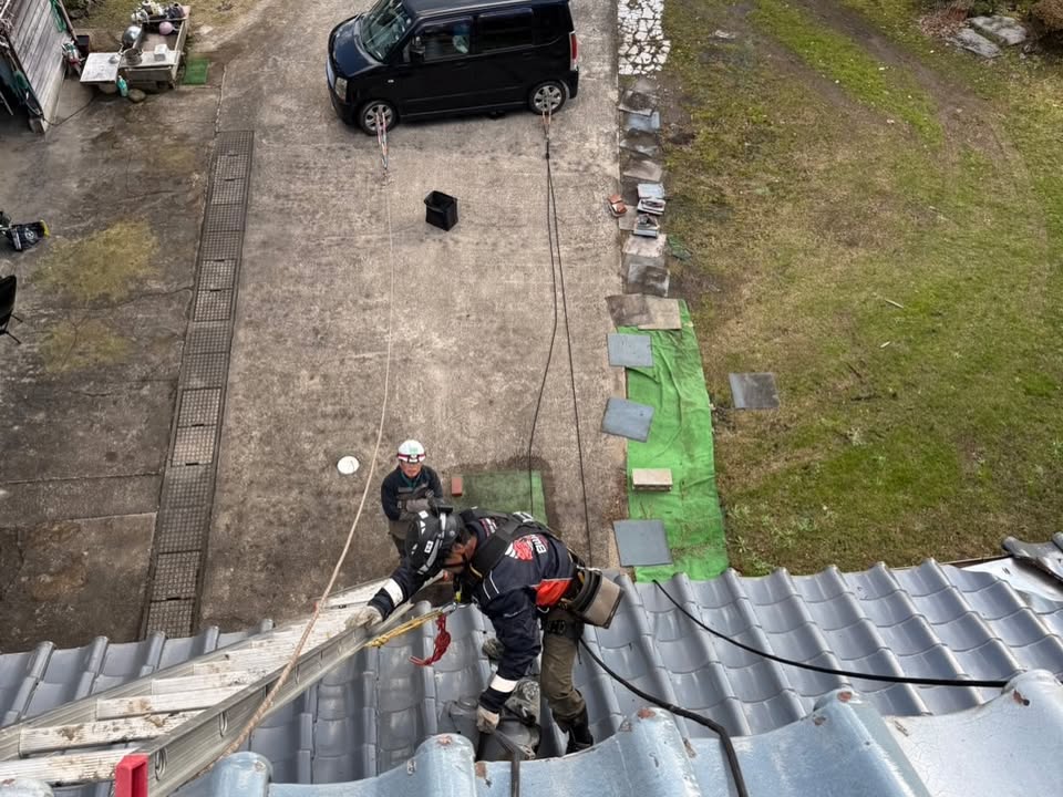 宮大工さんのお宅という事で、合掌造りのとても大きな家に苦戦しながらも、危険瓦は全て撤去。シートも6割まで張る事ができました。