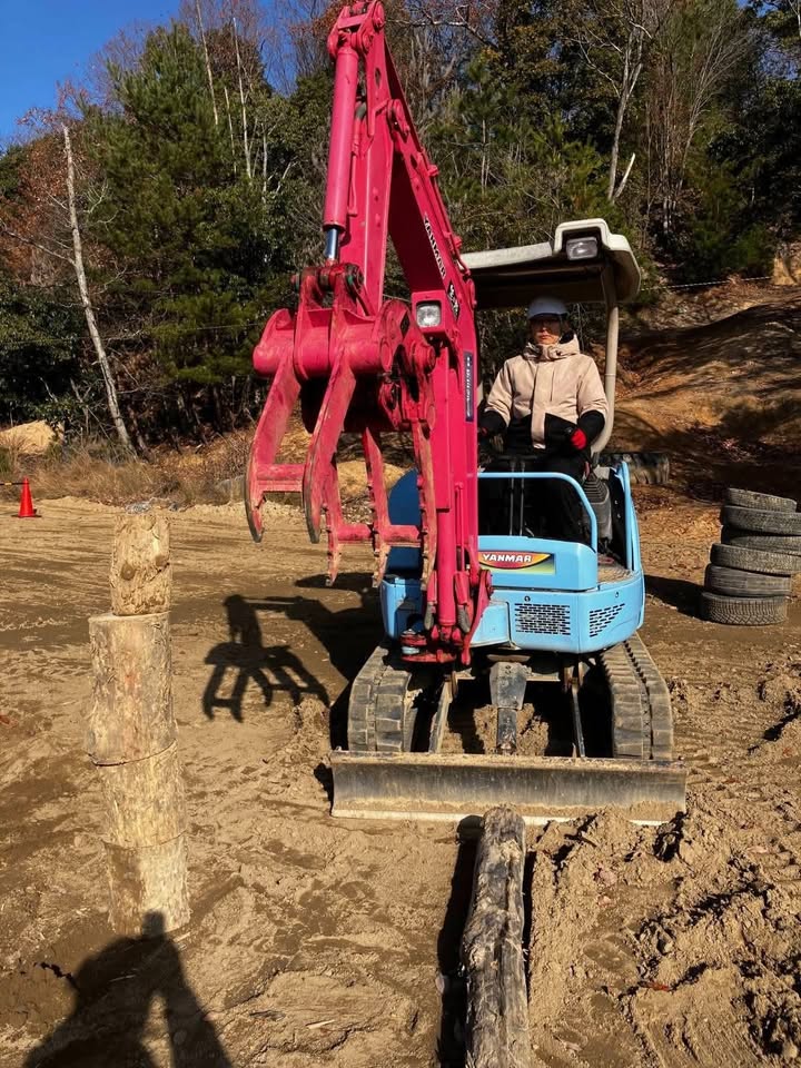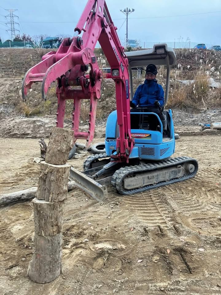 最後は丸太をトンボ代わりにして地面をならす事を見て頂き、